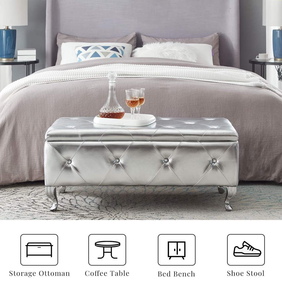 Faux Leather Rectangular Storage Ottoman Bench for Bedroom Upholstered End Bed Footrest with Crystal Buttons Stools & Ottomans