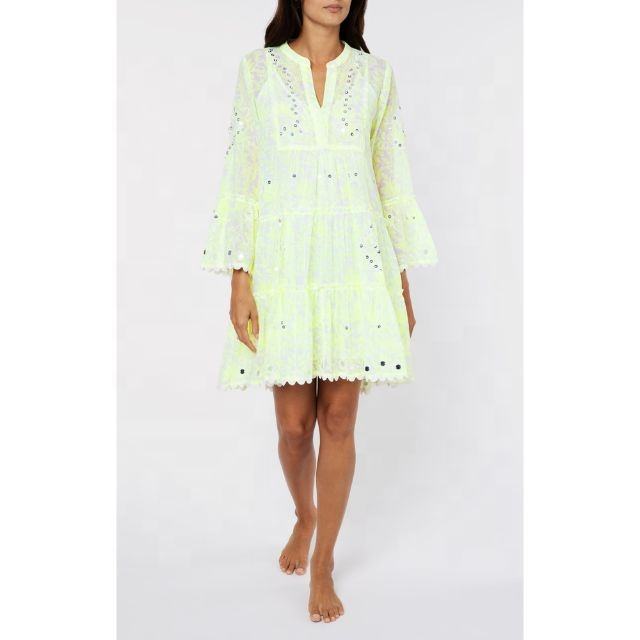 Women's Flared Sleeve Sundress Yellow Screen Print Paillettes Sequins Hand Work Embroidered Tunic Feminine Flattering Natural