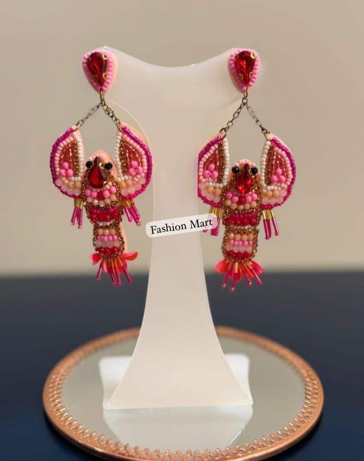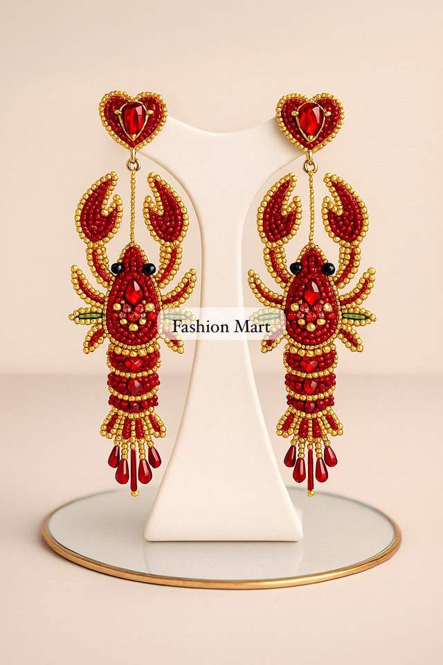 Festival Red And Gold Crawfish Earrings Handcrafted Pearl Bead Danglers
