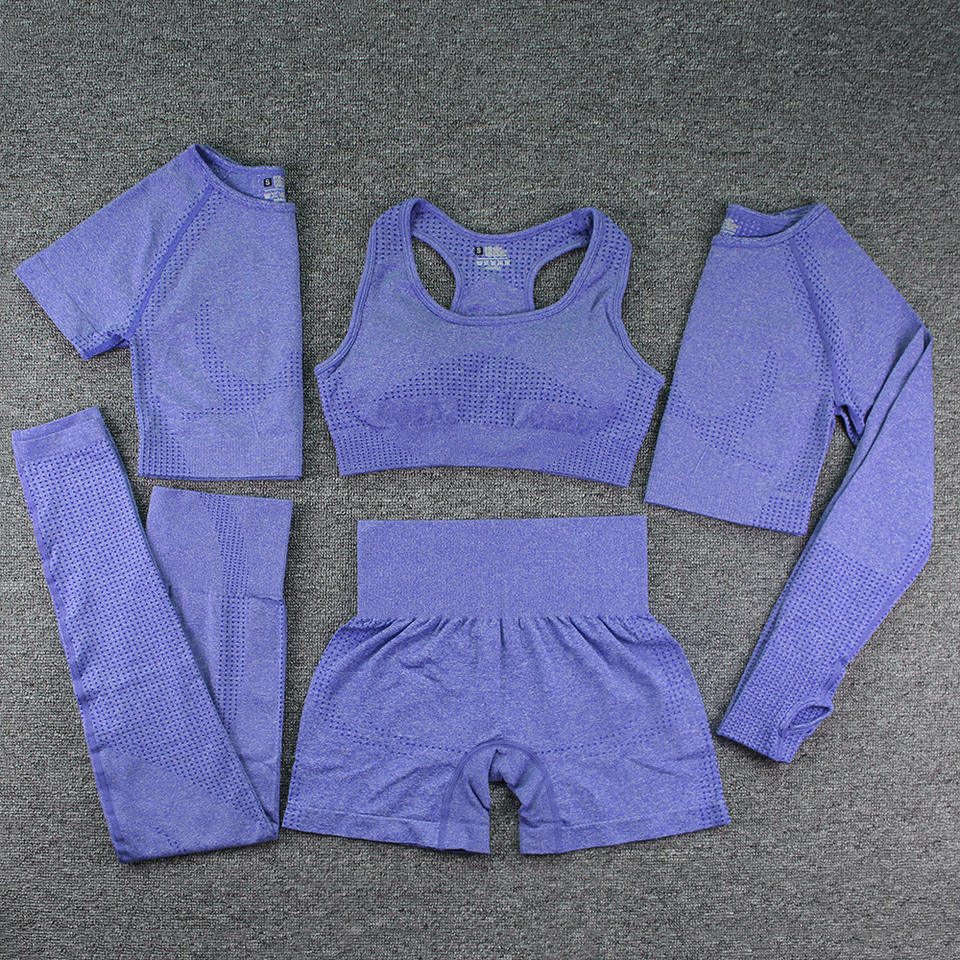Fiess Sportswear Seamless Workout Yoga Set 5PCS Long Sleeve Crop Top Bra Shorts Leggings Pants for Running Training Solid Color