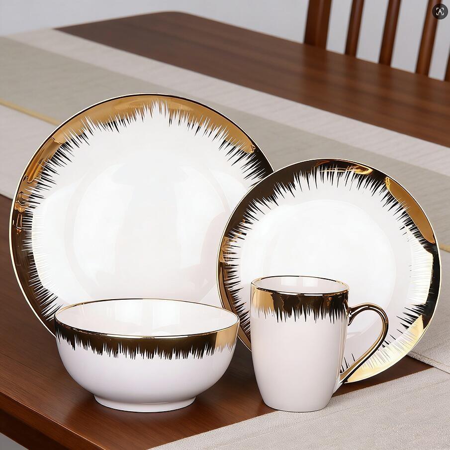 Fine Gold Rim White Ceramic Dish Porcelain Bone China Dinnerware Plates Set