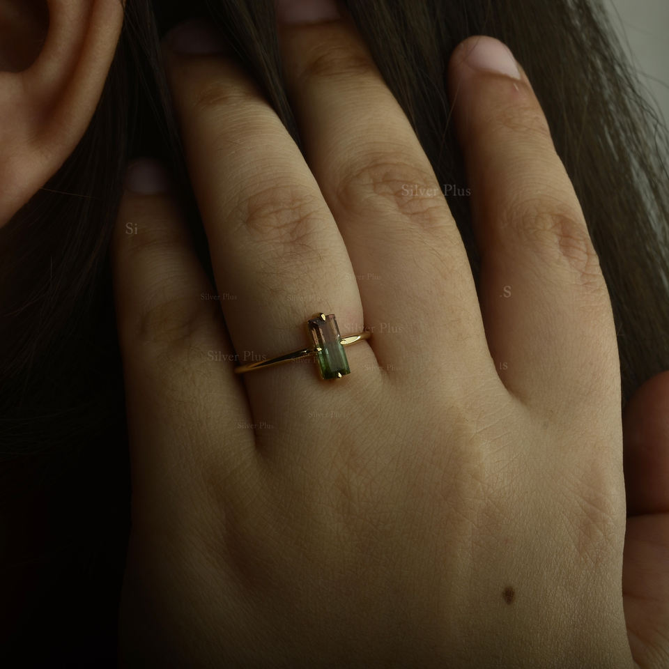 Fine Jewelry 14K Solid Gold Baguette Genuine Watermelon Tourmaline Prong Set Gold Ring Engagement Ring Producible In 10K/18K