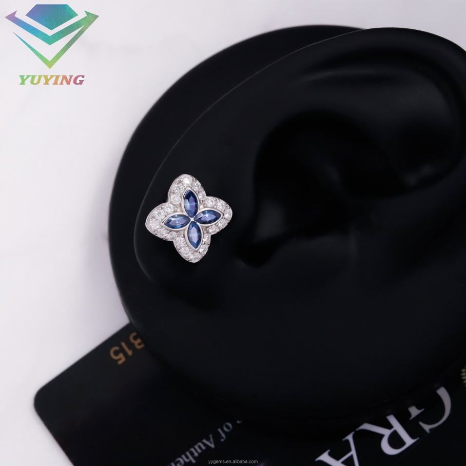 Fine Jewelry Sapphire Blue Moissanite Four Leaf Clover Style 925 Silver White Gold Plated Flower Stud Earrings Men Women