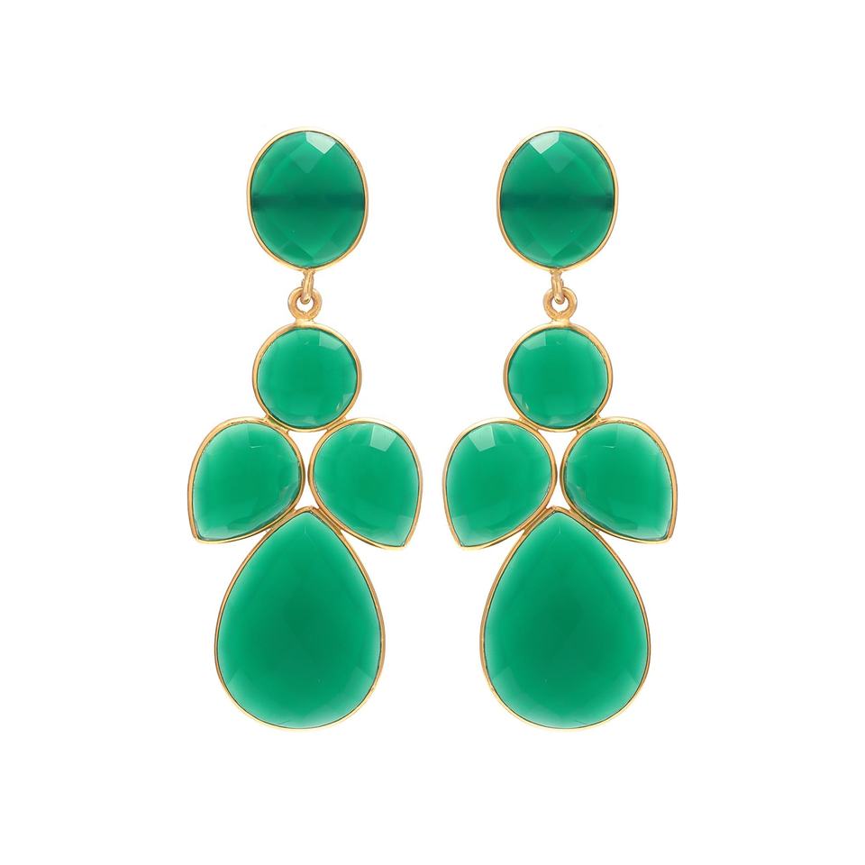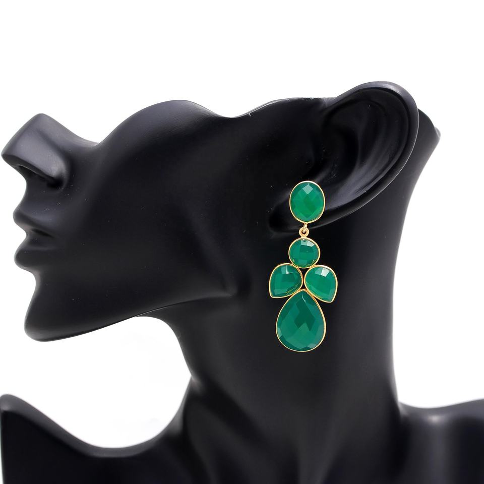 Fine Natural Green Onyx Gemstone Chunky 925 Sterling Silver Handmade Gold Plated Trendy Wedding & Party Chandelier Earrings