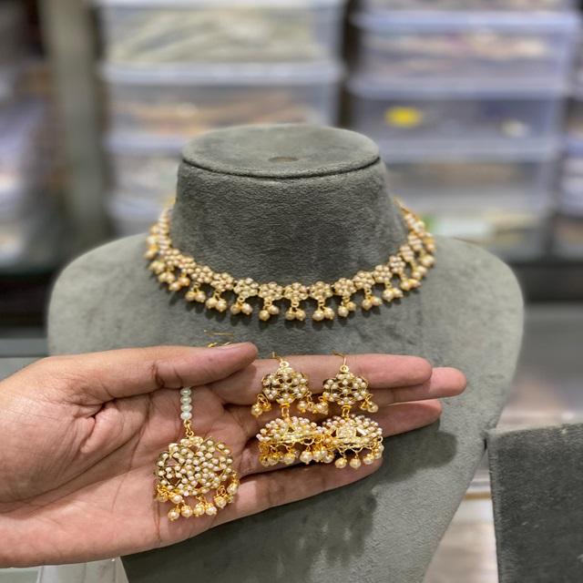 Fine Quality Traditional Punjabi Jadau Imitation Pearl Necklace Set Gold Plated Brass Jhumkas Tikka Vintage Ethnic Wedding Gift