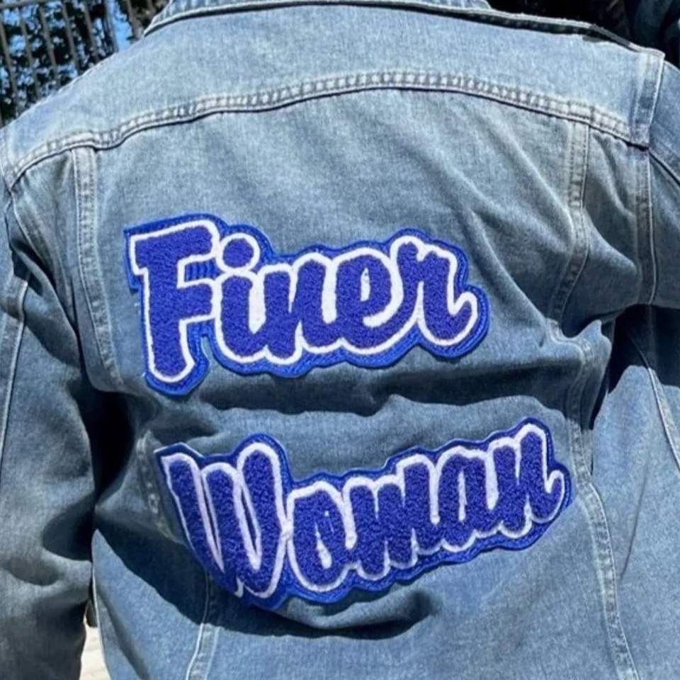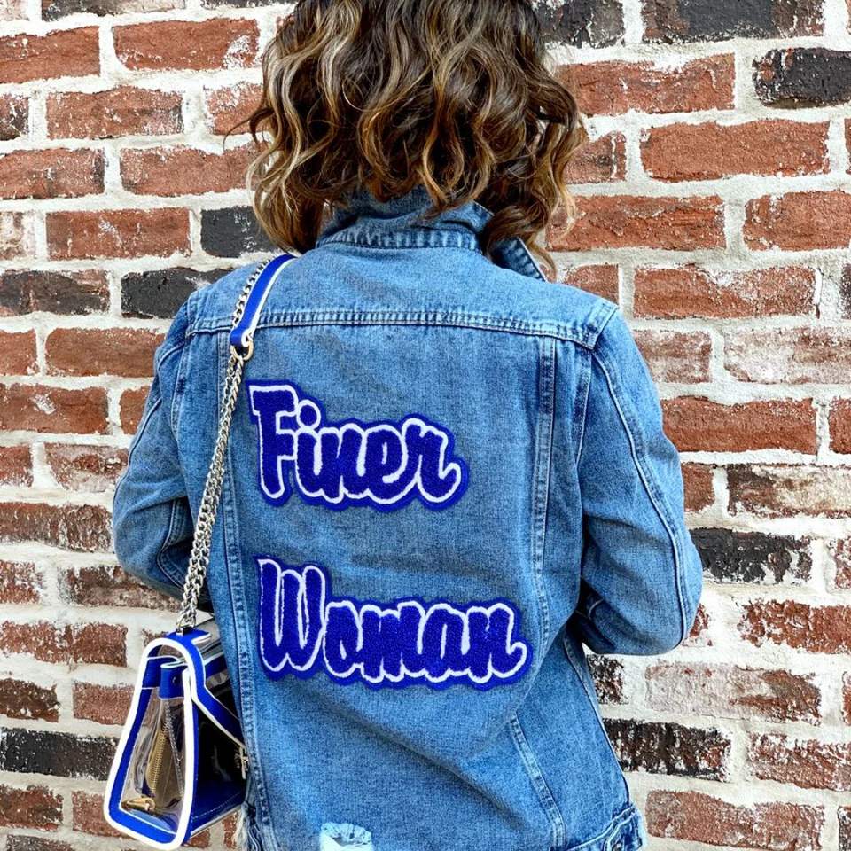 Finer Woman Denim Jacket with Embroidered Text on Back for Casual Greek Life Fashion and Sorority Style
