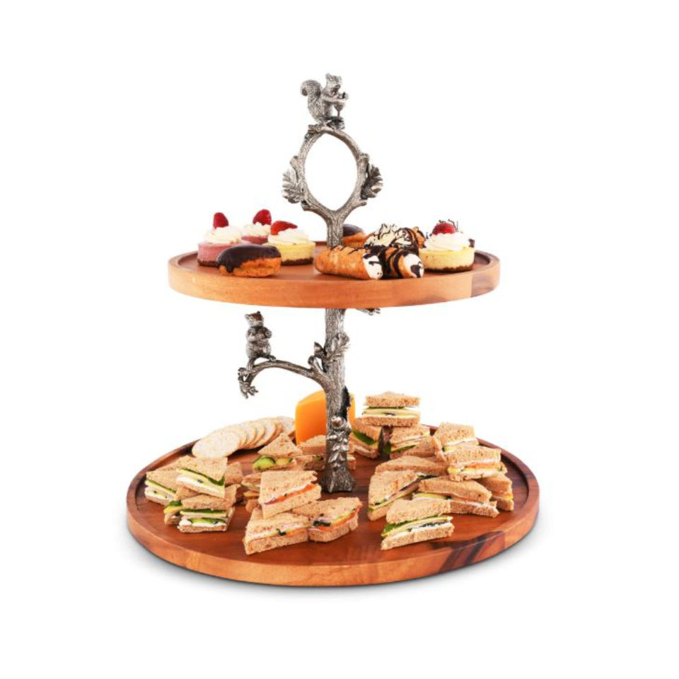 Finest Quality 2-Tier Acacia Wood Cheese Stand Song Bird Inspired Cupcake & Cake Serving Stand for Weddings & Parties