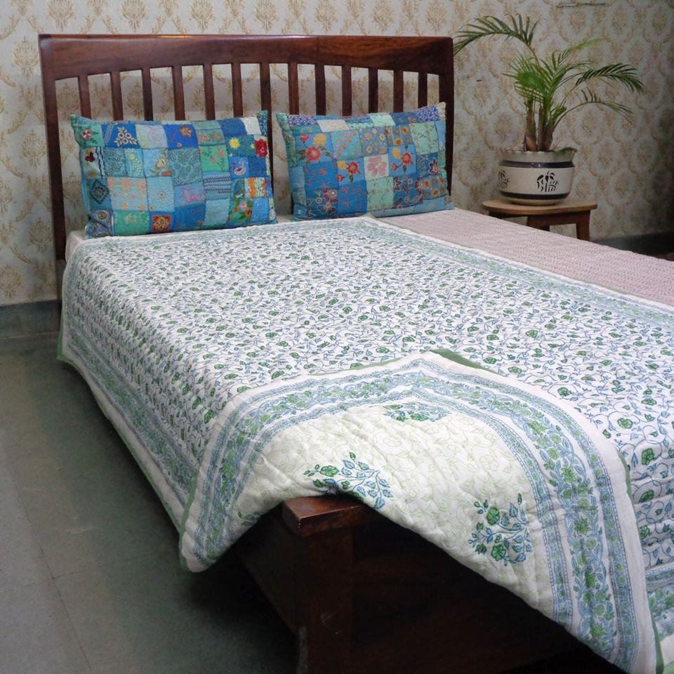 Trendy Kali Green Indian Geometric Hand Block Printed Soft Organic Cotton Quilt All-Season Twin Size Best Quality Low Hotel