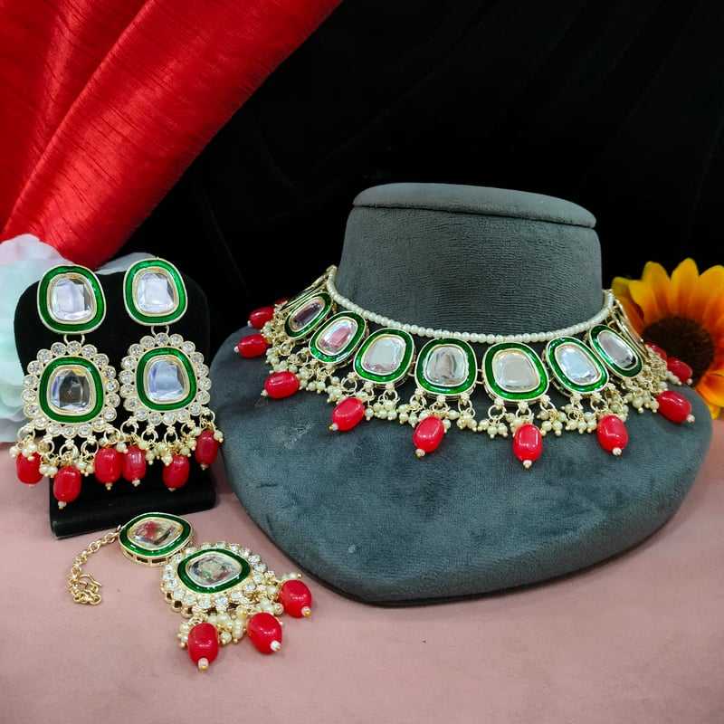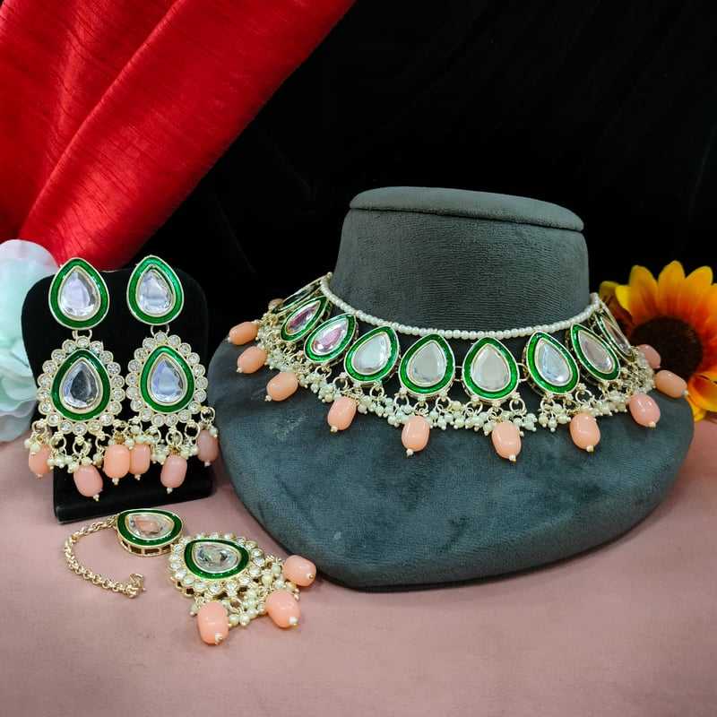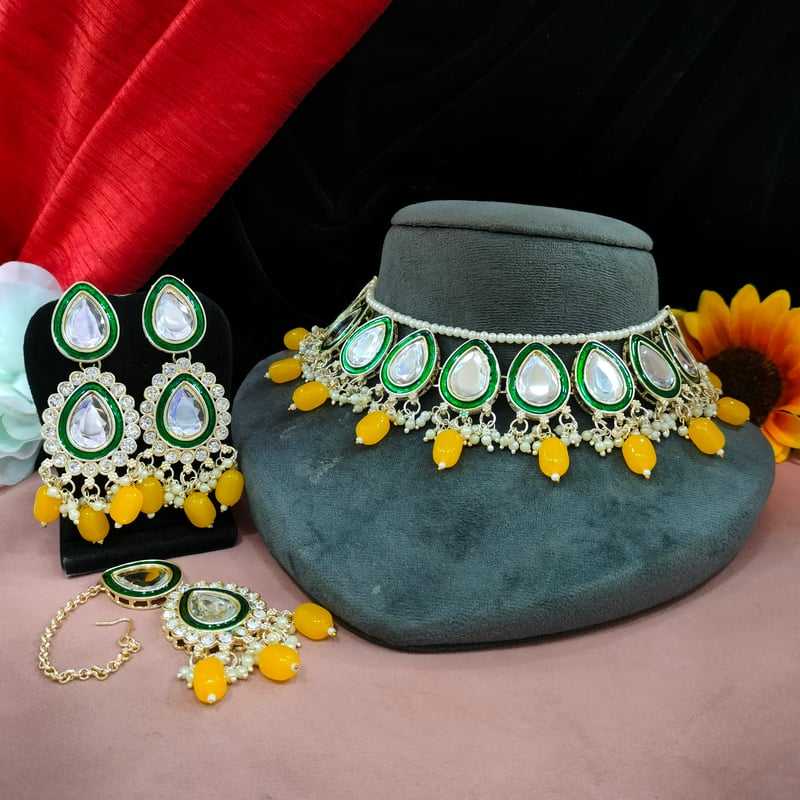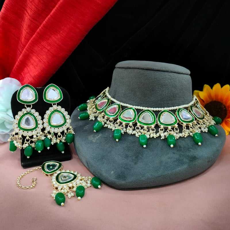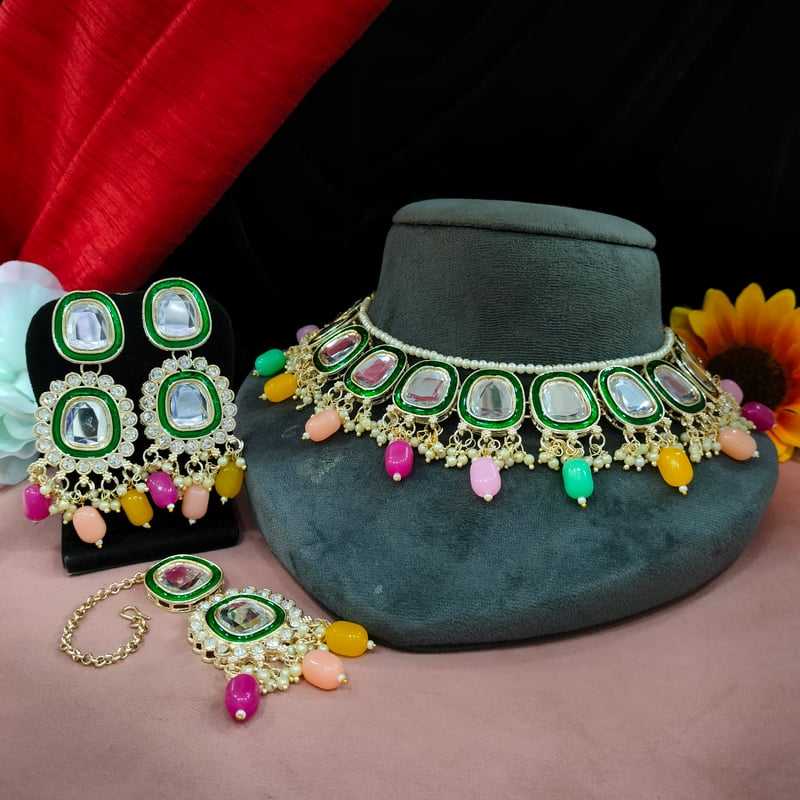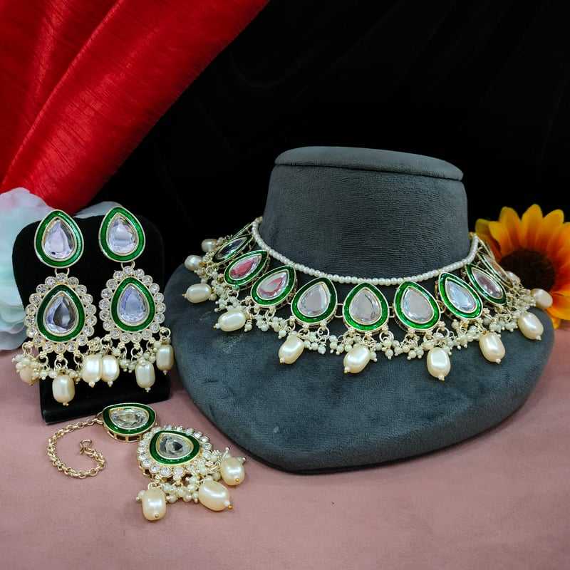 Finest Quality Royal Charm Ethnic Fashion Statement Necklace Earrings Set Maang Tikka Kundan Imitation Pearls for Wedding