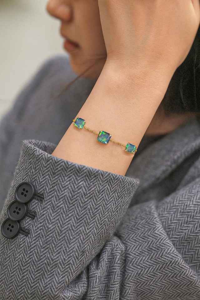 Fire Black Opal Octagon Stone Bracelet 925 Sterling Silver 14K Gold Plated Minimalist Three Stone Jewelry
