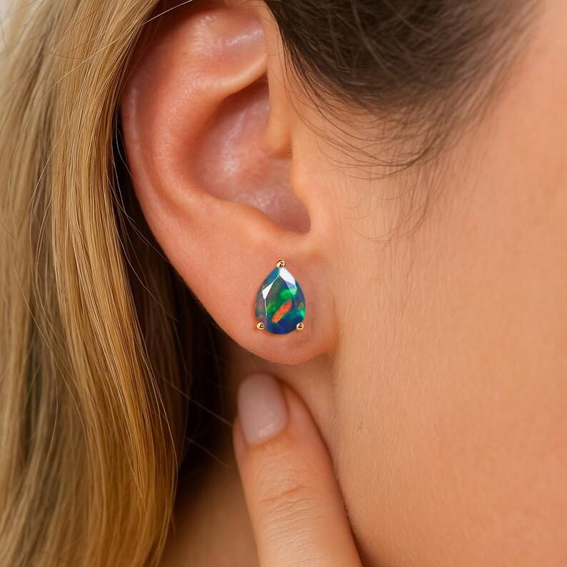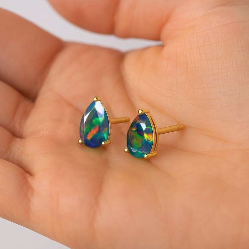Fire Black Opal Pear Gemstone Stud Earrings Natural Fire Opal 925 Sterling Silver 14K Gold Plated Opal Birthstone Gift
