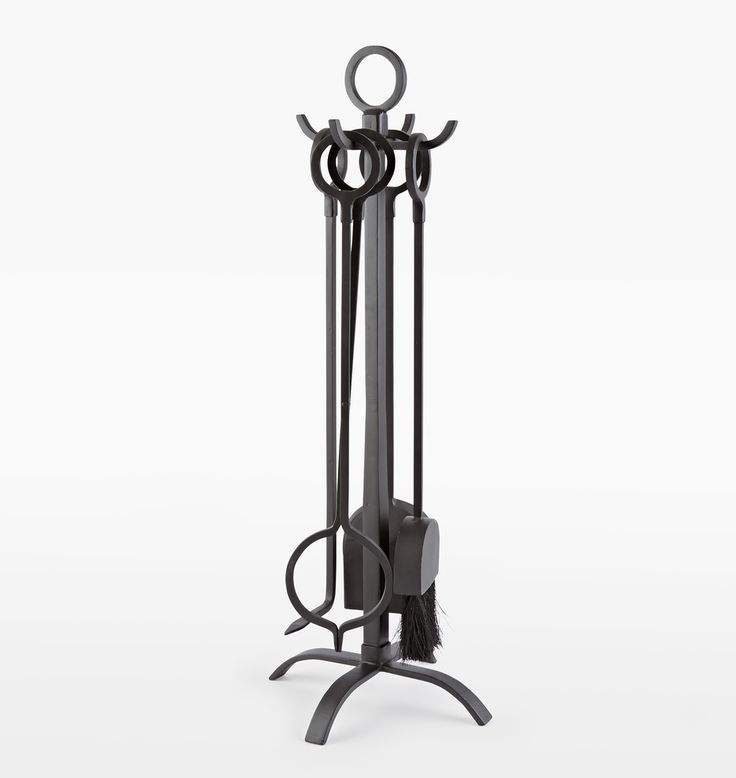 Fireplace accessory set in black iron with wide base and traditional tools ideal for interior designers or decorators