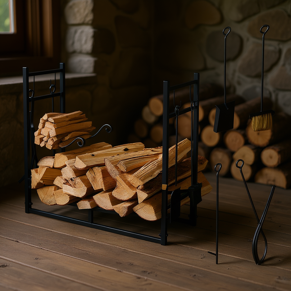 Firewood Rack Metal Powder Coated Rectangle Classic Indoor Fireplace Tools Set