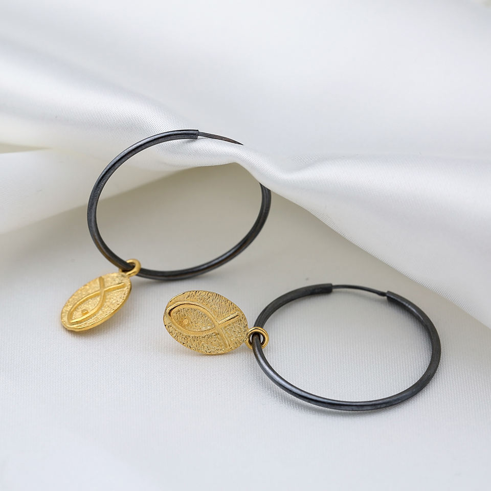 Fish Shape Charm Oxidized Hoop Earrings Handmade 925 Sterling Silver Vintage Jewelry