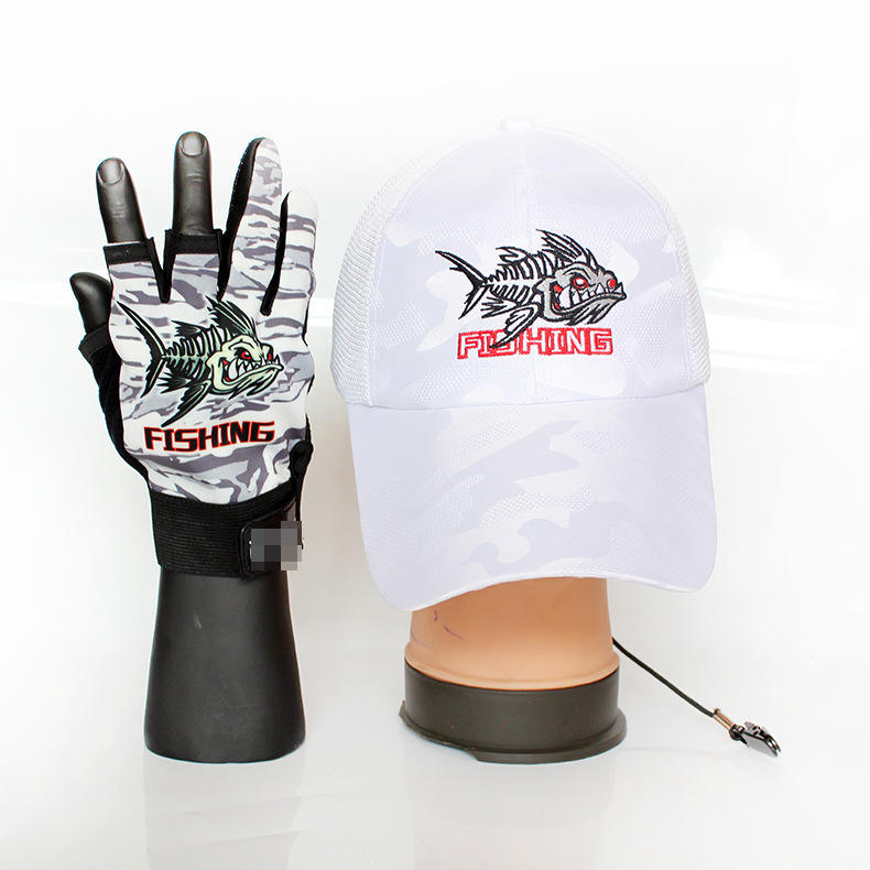 Fishing Hat And Gloves Set Printed Red Camo Design Outdoor Sun Protection Mesh Cap With Fish Logo Two Piece Gear