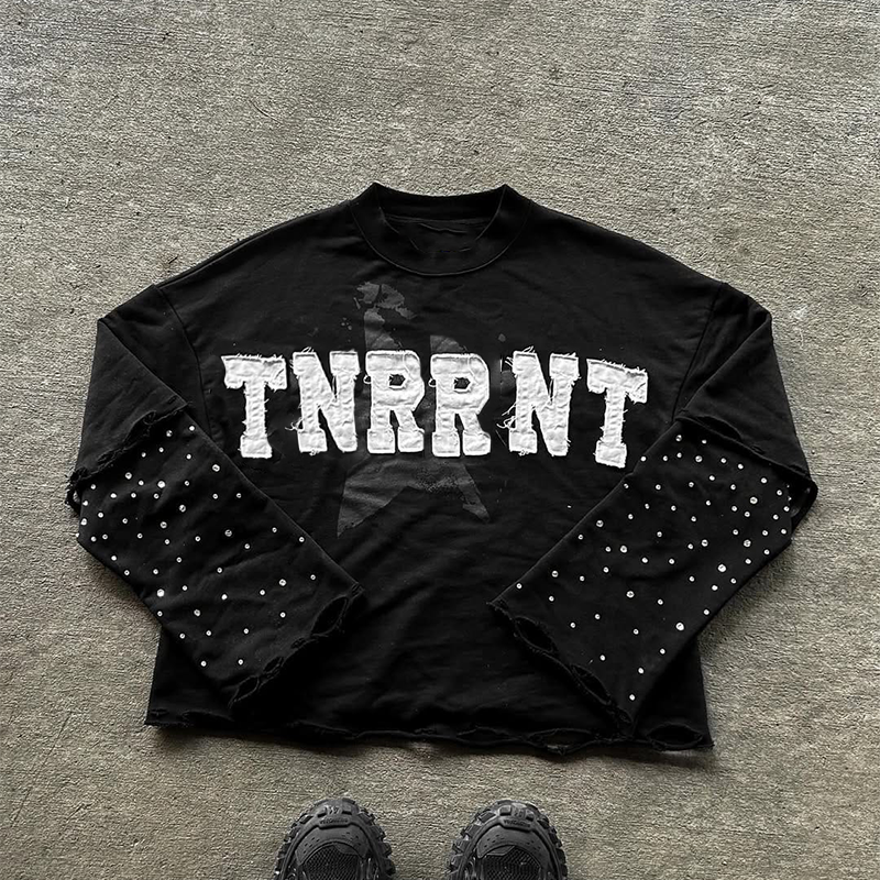 Fitted Oversized Thick Cotton Red Round Collar Neck Flare Long Sleeve T-shirt Custom Print Graphic rhinestone Design T shirt
