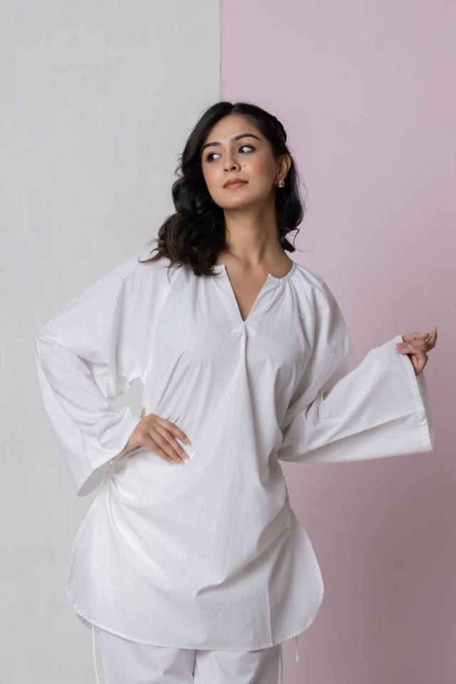 White Relaxed Co-ord Set Slip-on Side Drawstrings V-neck Wide-leg Pants Natural Waist 100% Cotton Perfect for Casual Elegance