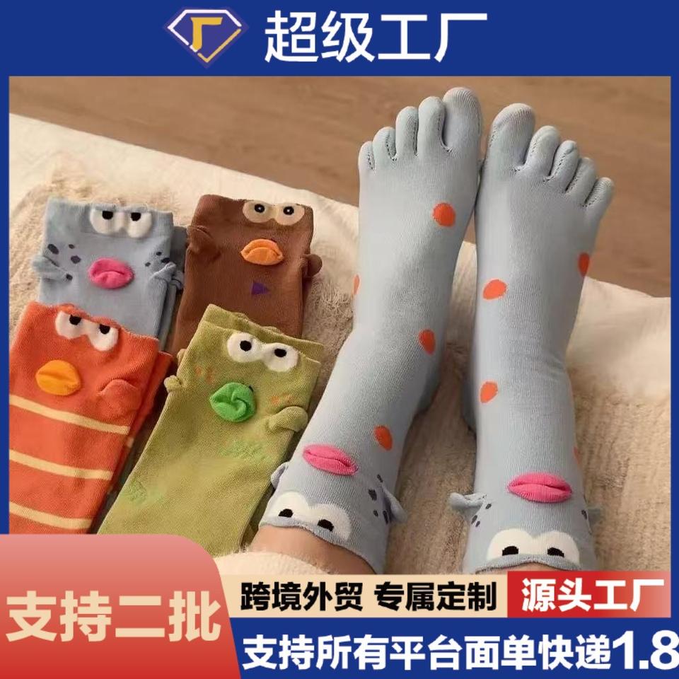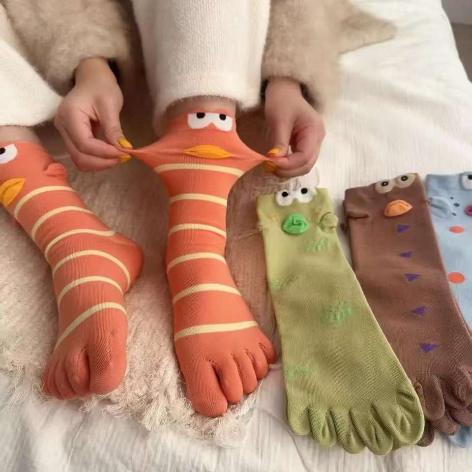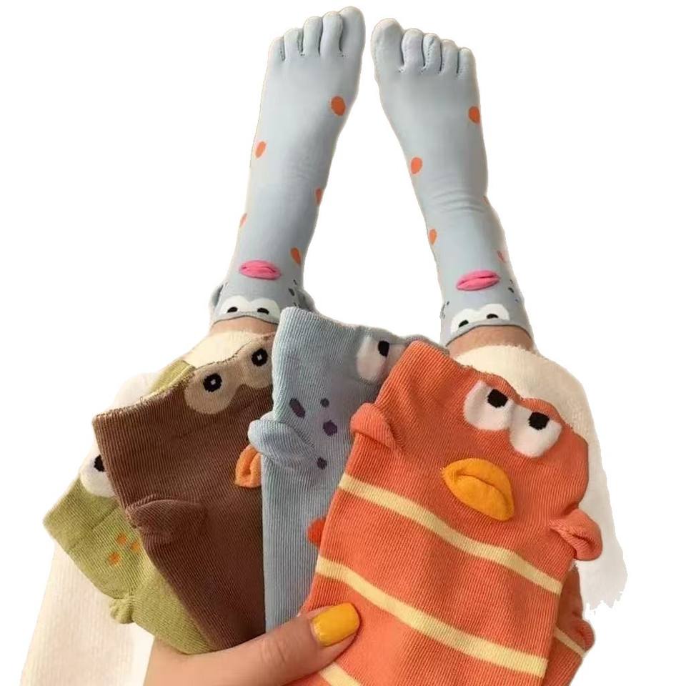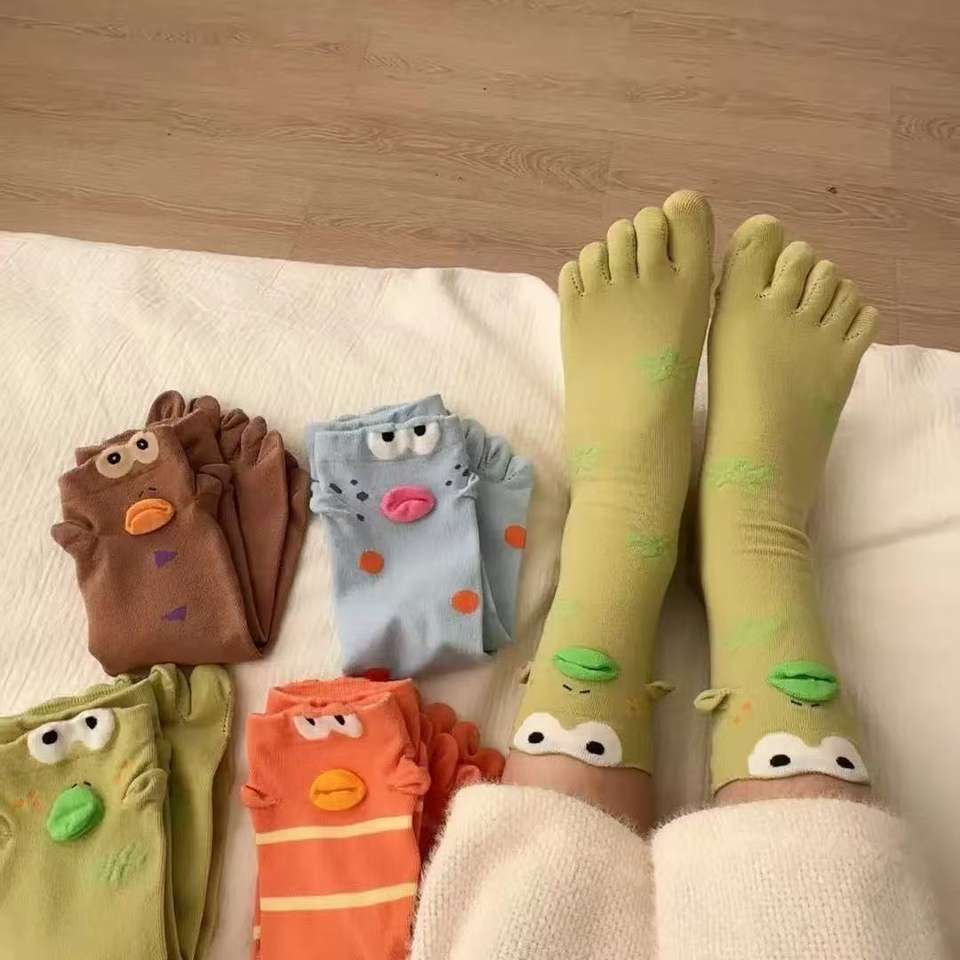 Five-Toe Mid-Calf Socks With Animal Patterns Cotton Antibacterial For Women Casual Sports Socks Orange Brown Green Blue