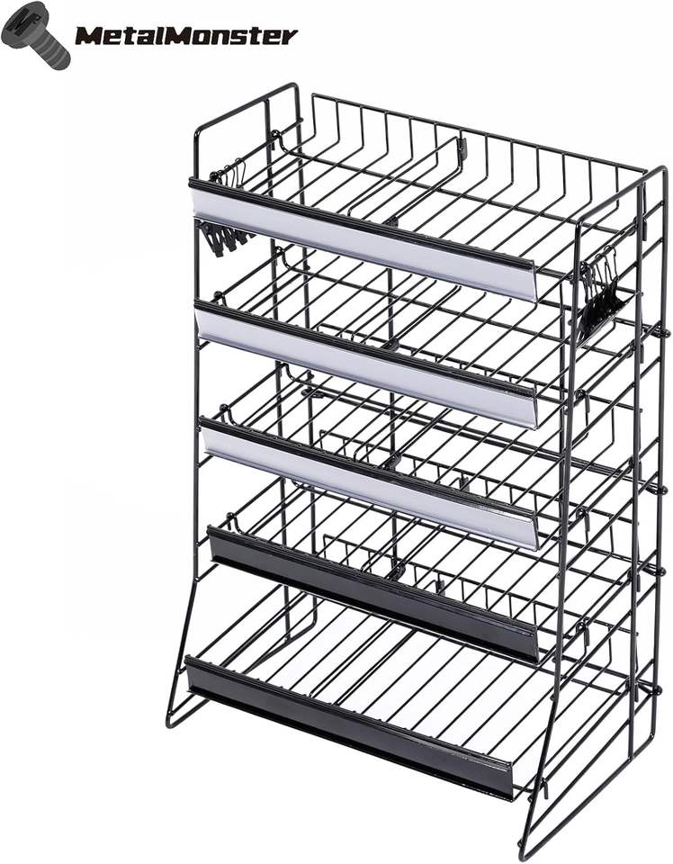Five-tier display stand for candy stands, metal frame with grid, 8 chip holders and countertop store label