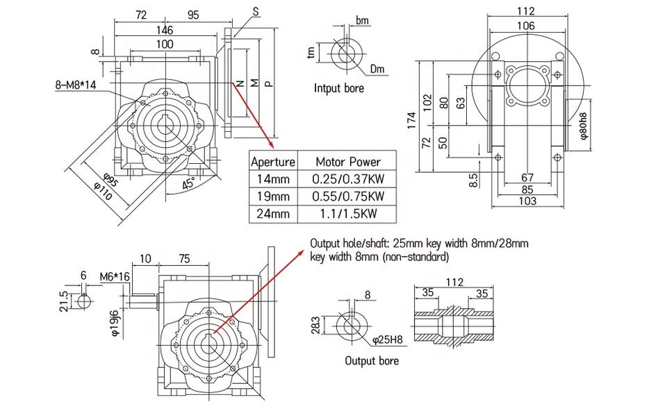 Output Shaft Hole:25/28 mm( key width:8mm)