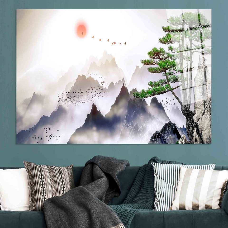 Flat Printed Canvas Artwork: Japanese Minimalist Mountain View Decor,TEMPERED GLASS ART