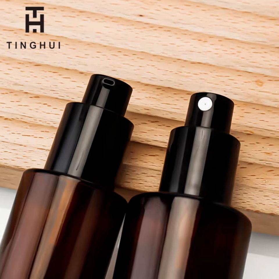 Flat Shoulder Refillable Spray Bottle Serum Essential Oil Perfume 30ml 50ml 80ml 100ml Amber Glass Pump Bottles Skin Care Cream