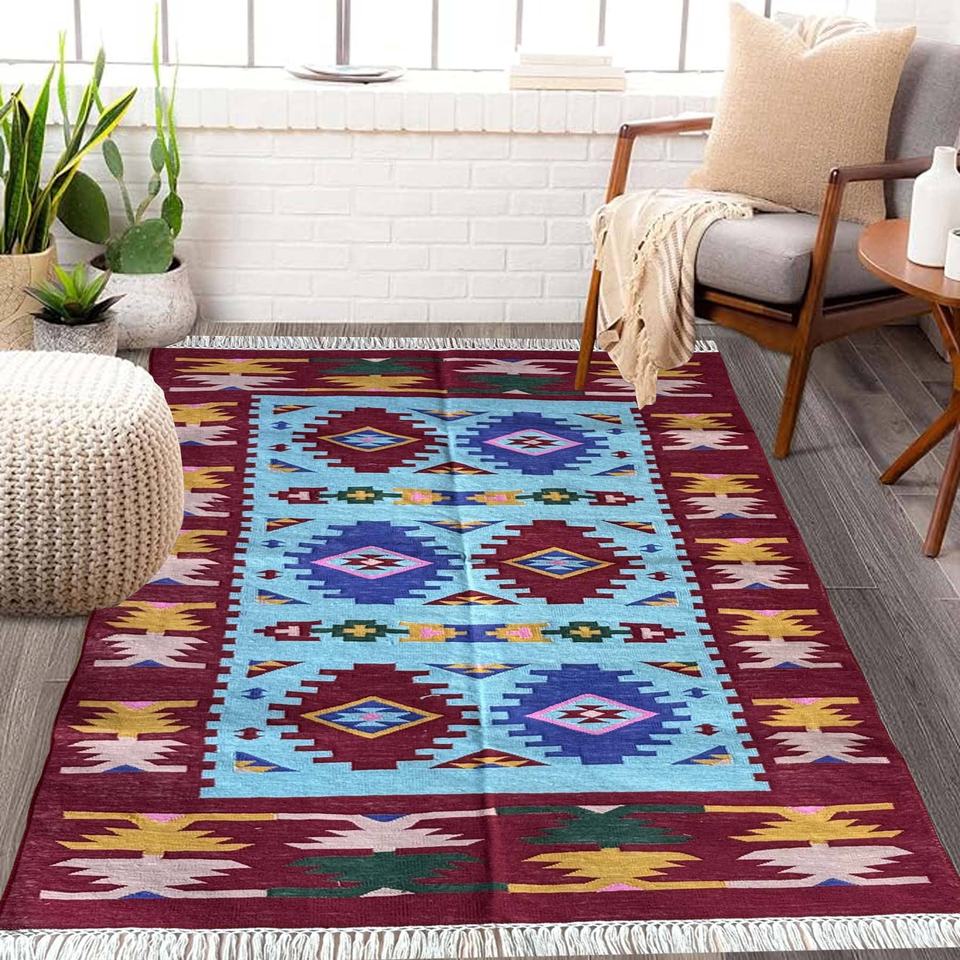 Custom Geometric Flat Weave Rug Handmade by Skilled Indian Artisans Blue and Red Vegetable Dyed Cotton Area Rugs & Sets