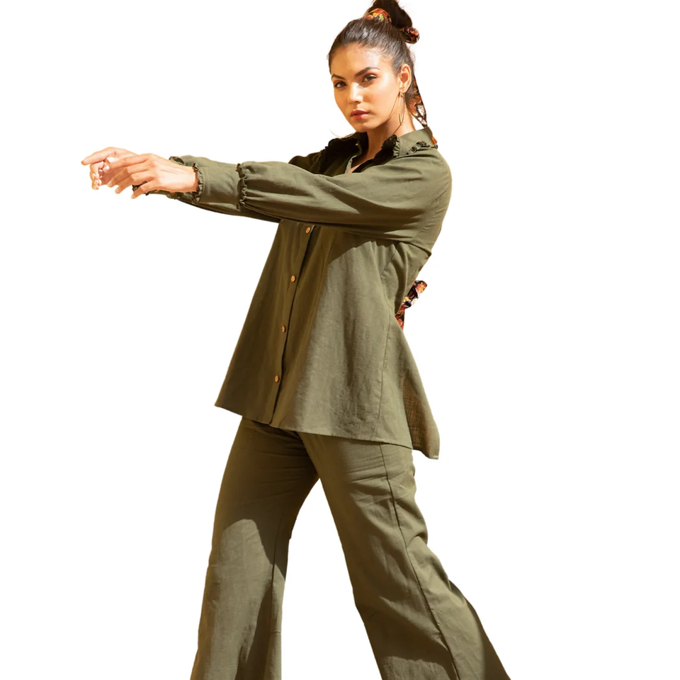 Floral Back Tie up Olive Green Shirt Pant With Element in Collar and Sleeves Cuff Summer Spring Two-Piece Co-Ords Set Top Bottom