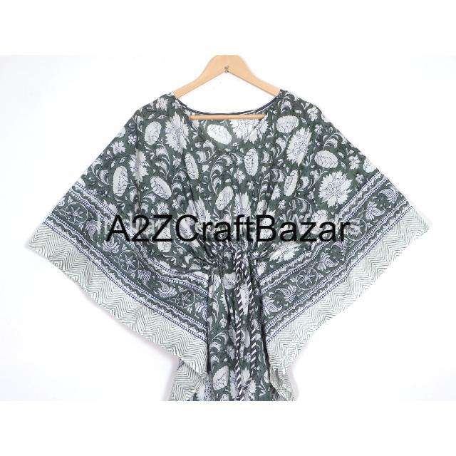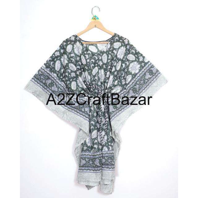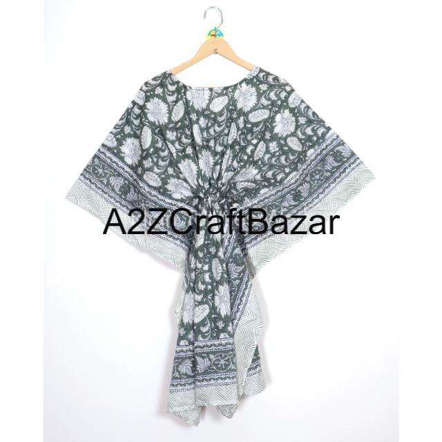 Floral Block Printed Handmade Woven Cotton Fabric Women's Floor-Length Bohemian Hippie Style Kaftan Tunic Summer Beach Dress