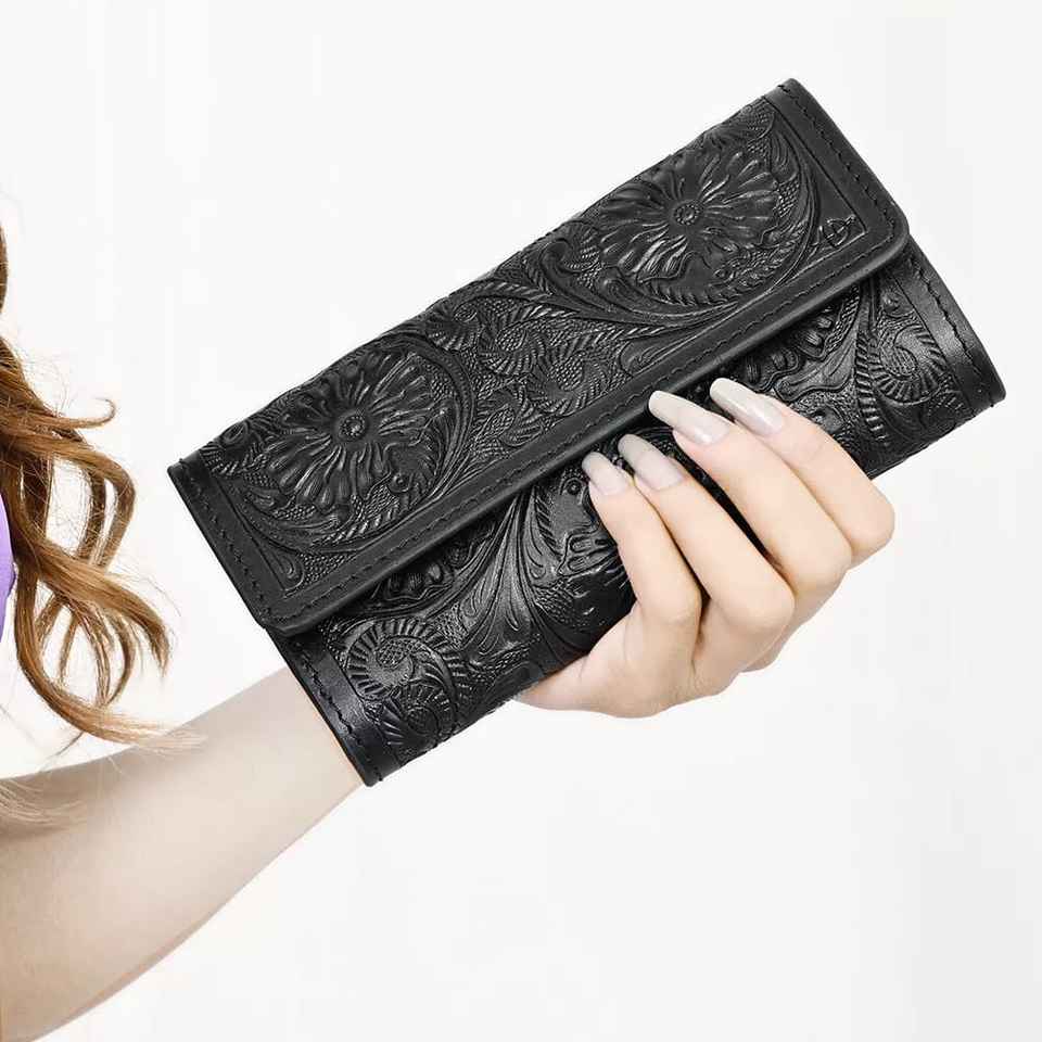Floral Bohemian Western Trifold Wallet Custom Tassel Zipper Vintage High Quality Large Capacity Genuine Leather Portable Women's