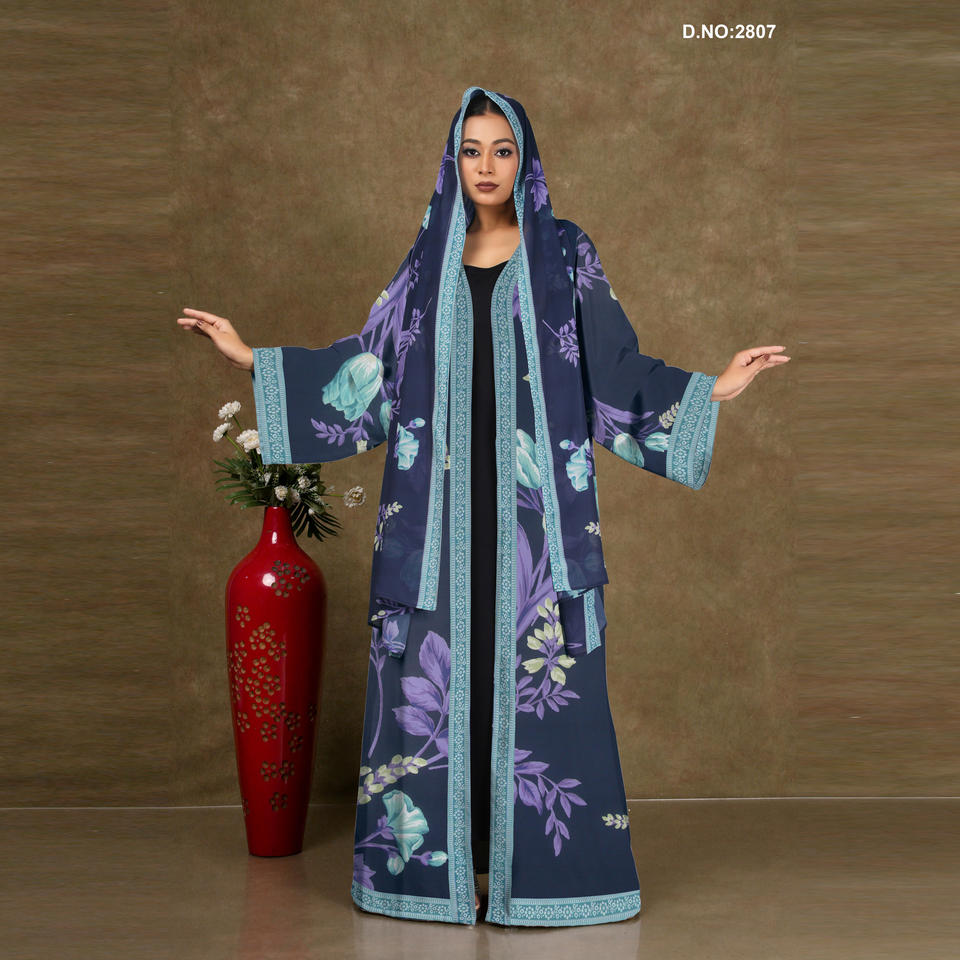 Floral Chiffon Abaya Shrug With Flowing Silhouette, Modest Layered Wear, Soft Drape, Elegant Borders, Contemporary Style