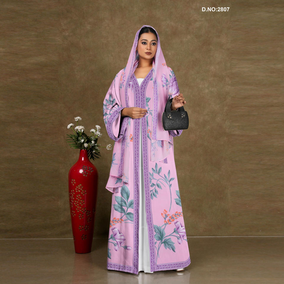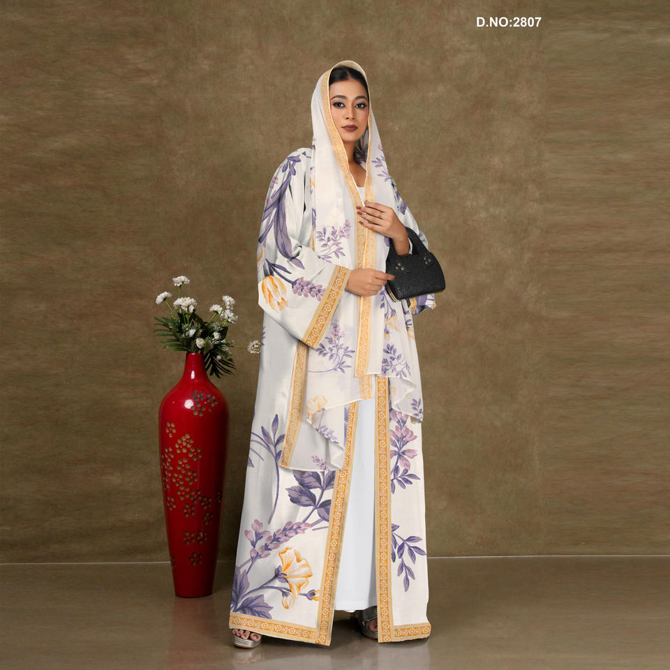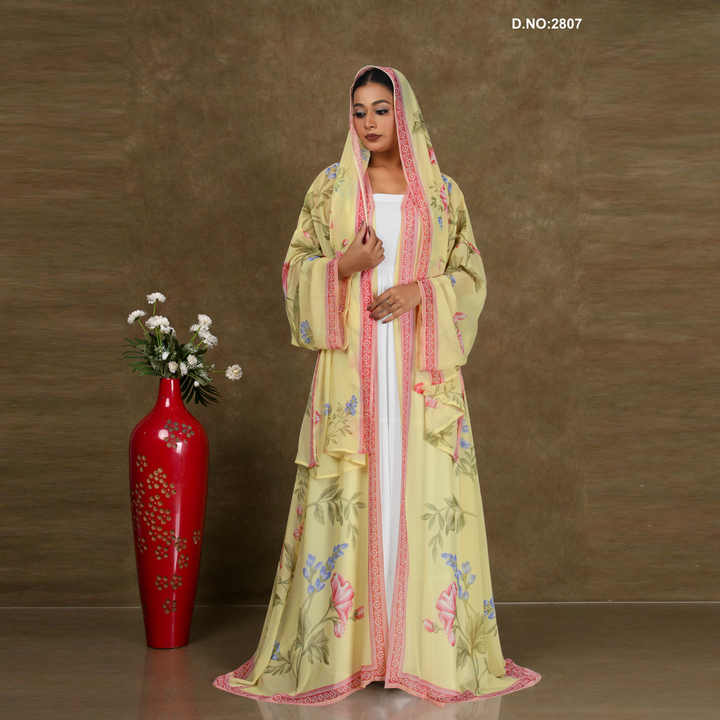 Floral Chiffon Abaya Shrug With Flowing Silhouette, Modest Layered Wear, Soft Drapape, Elegant Borders, Contemporary Style