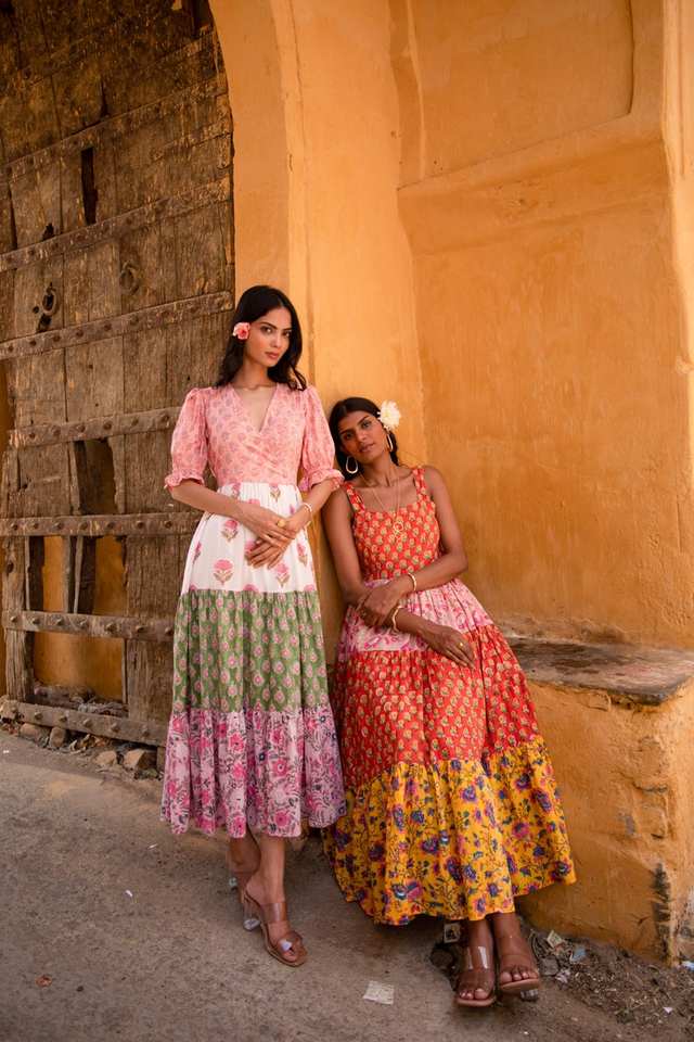 Floral Colour Block Tiered Organic Cotton Dress Hand Block Printed Ethical Sustainable Summer Dress