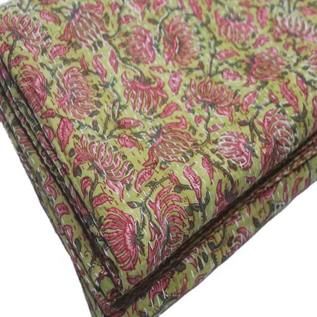 Handmade Ethnic Indian Floral Cotton Customized Color All-Season Kantha Quilt Blanket Printed Queen Size for Hotel & Home Decor