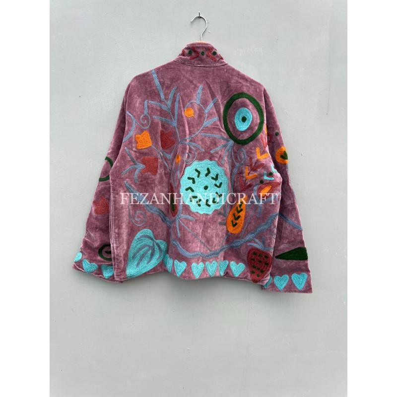 Floral Embroidery Stand Collar Cotton Lining Unisex Velvet Women's Suzani Jacket with Handmade for Autumn and Winter Casuals