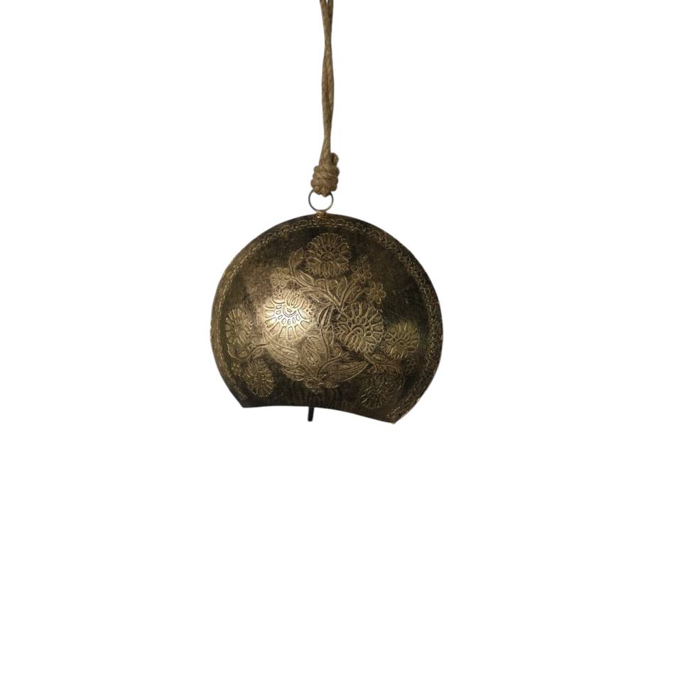 Floral Engraved Brass Half-Moon Hanging Bell Jute Rope Home Garden Balcony Entryway Wind Chime for Spiritual Meditation Metal