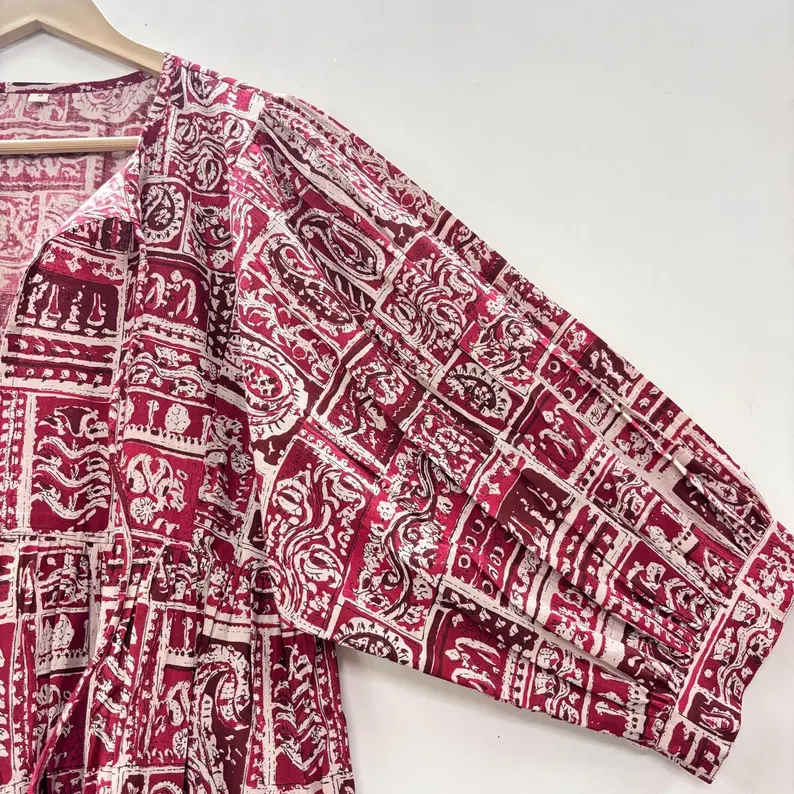 Floral Hand Block Print Eco-Friendly Cotton V-neck 3/4 Sleeve Lace Handmade Ruffle Hem Mini Dress Kyra Style Chinoiserie Formal