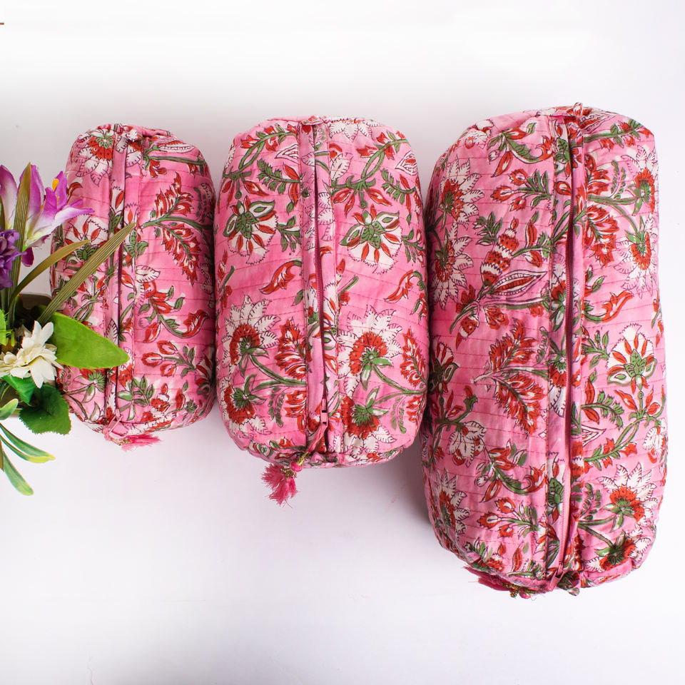Floral Hand Block Printed Zipper Quilted for Fashion Reusable Multifunction Make Bag Set Tassel Cotton Indian Travel Carry