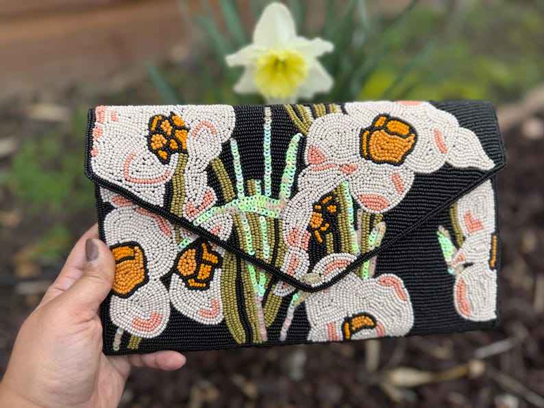 Floral Handmade Beaded clutch bag, daffodils beaded clutch, evening party bag with string, Gift for her, Bridal wedding bag