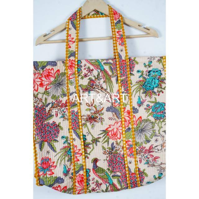 Floral Handprinted Large Quilted Tote Bags Boho Overnight Weekender Beach Tote Bag Eco Friendly Shopping Grocery Travel