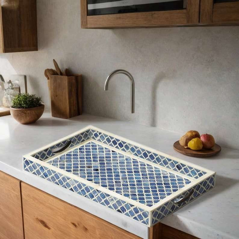 Floral Harmony Bone Inlay Serving Tray | Handcrafted Decorative Tray in Blue & White with Delicate Flower Motif, Available