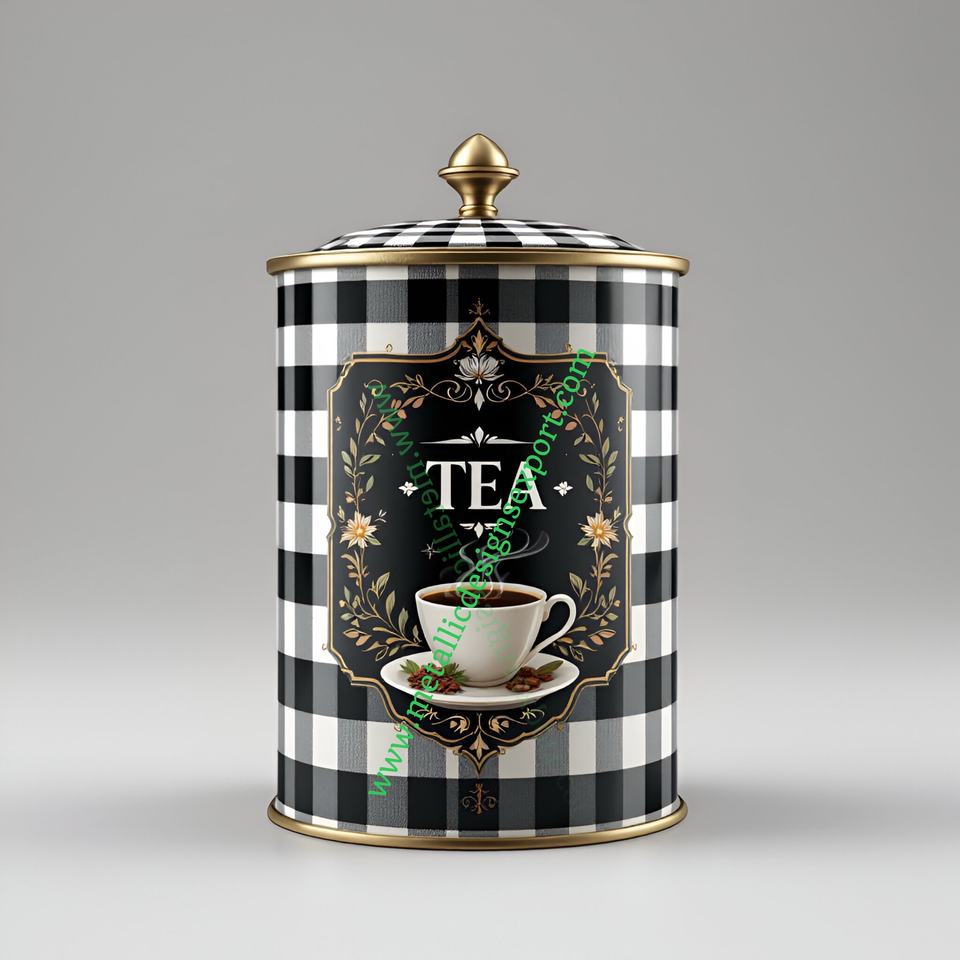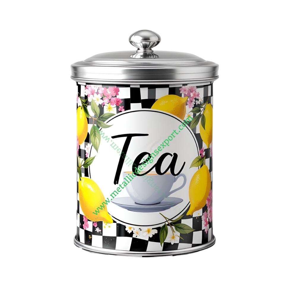 Floral Lemon Design Metal Storage Jar Silver Lid Black White Checkered Style for Kitchen Decorative Canister Food Set Wedding