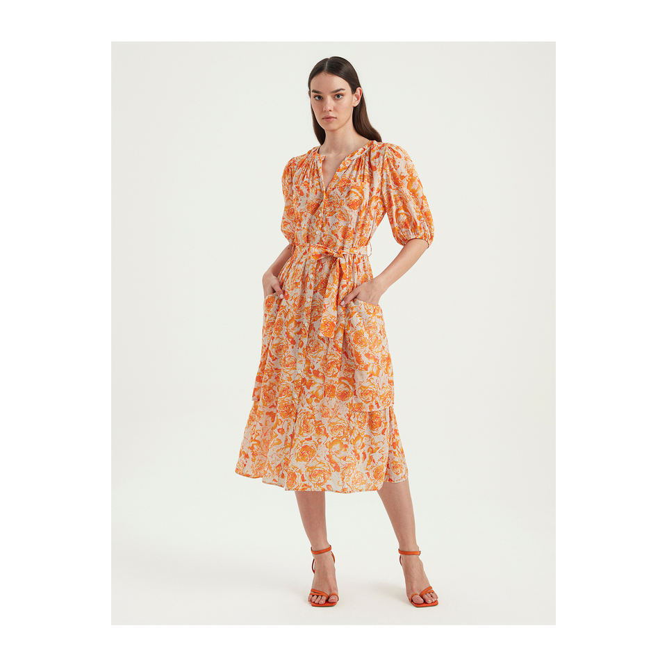 Floral Patterned Balloon Sleeve Belted Double Pocket Midi Dress Viscose Blend Comfortable and Stylish