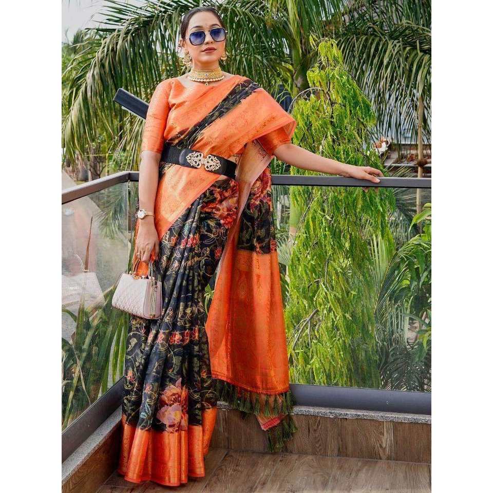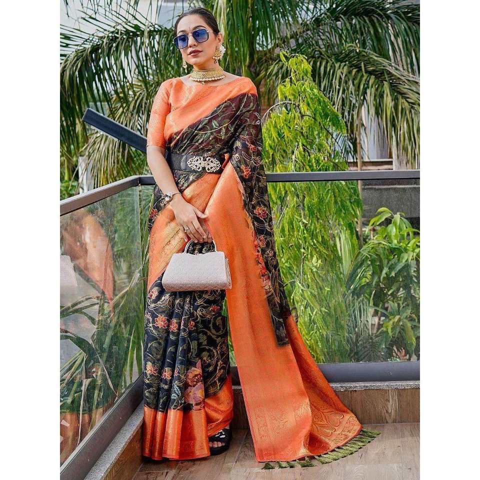 Floral Printed Black Organza Evening Dress Beautiful Saree for Festive Wear