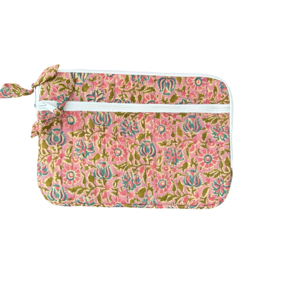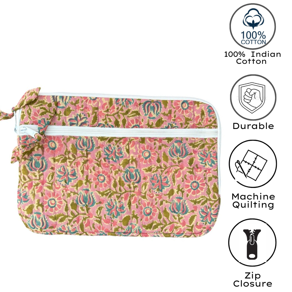 Floral Printed Handmade Quilted Laptop Sleeve Cotton Jaipur Artisan Block Print Zippered Lightweight Durable Machine Washable