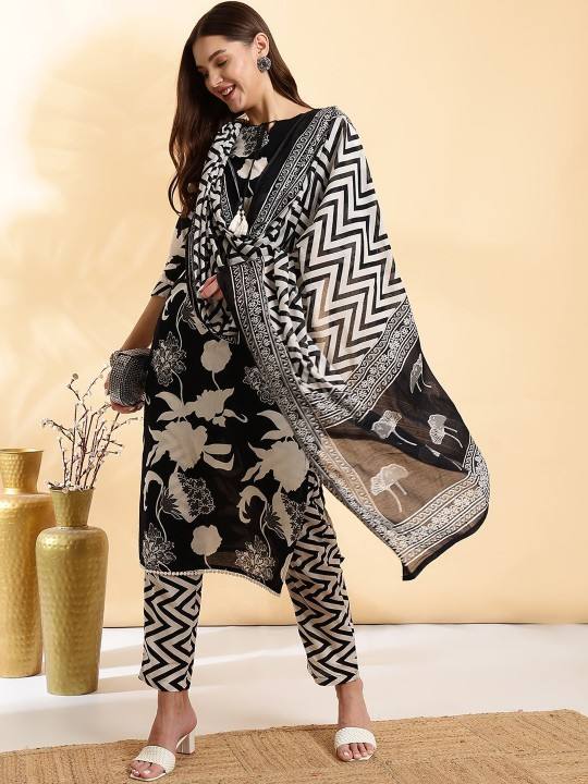 Floral Printed Regular Pure Cotton Straight Kurta with Trousers & Dupatta For Women Bulk product Customized Women Clothing