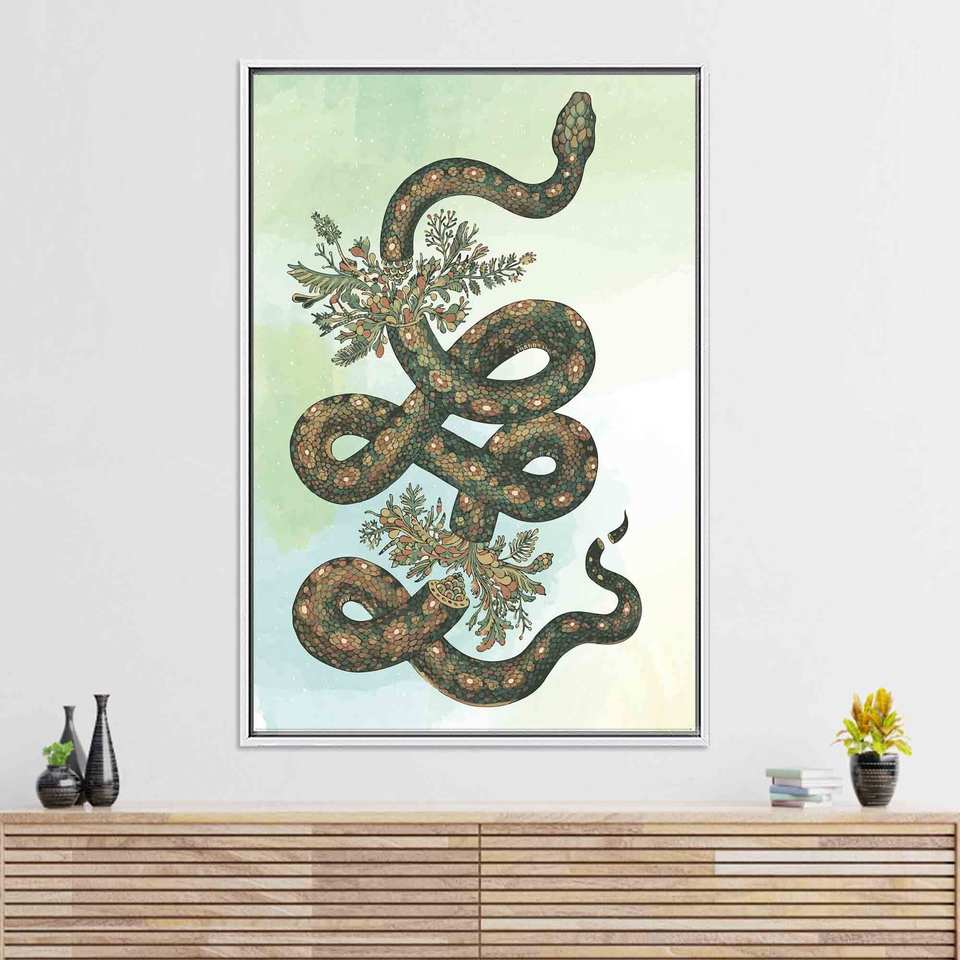 Floral Snake Printed Canvas: Elegant Animal Illustration Decor,WHITE FRAMED CANVAS