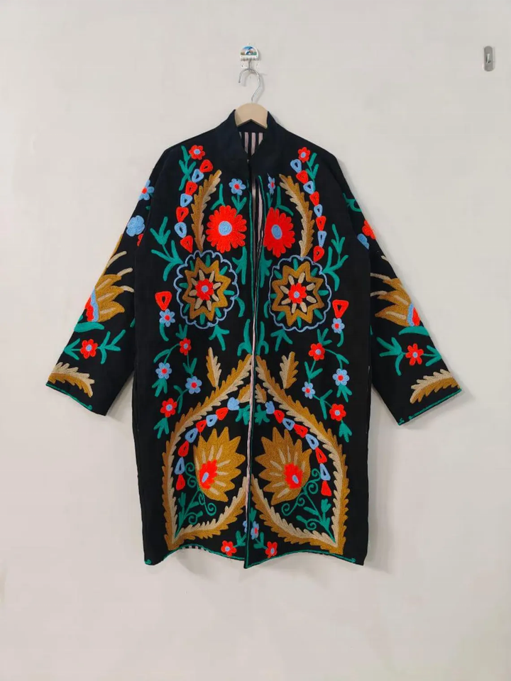Floral Suzani Embroidered Jacket Boho Handmade Long Coat Festival Kimono Duster Velvet Robe Winter Cotton Filled Breathable Robe