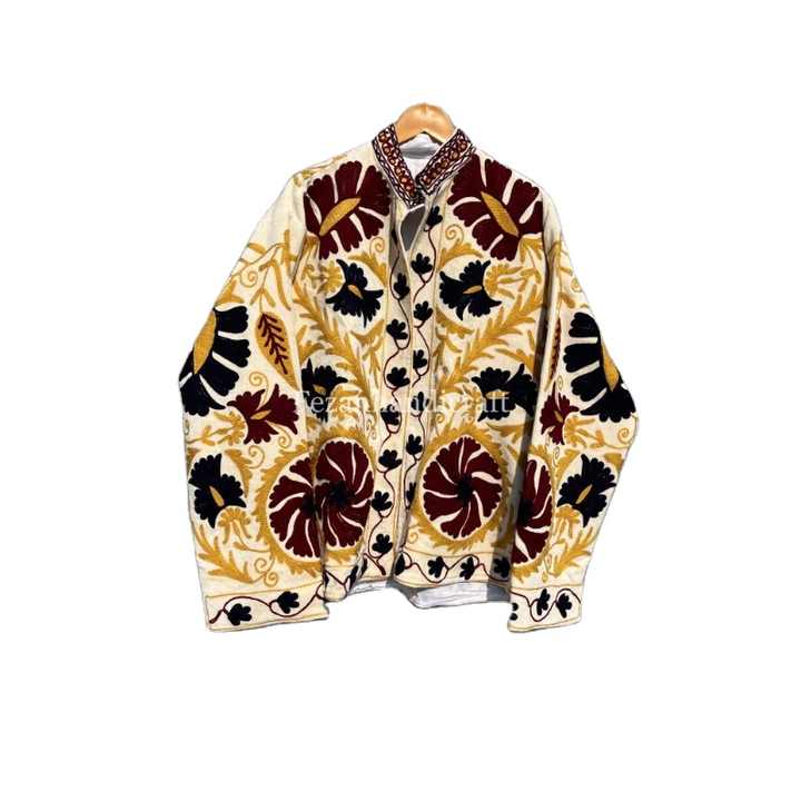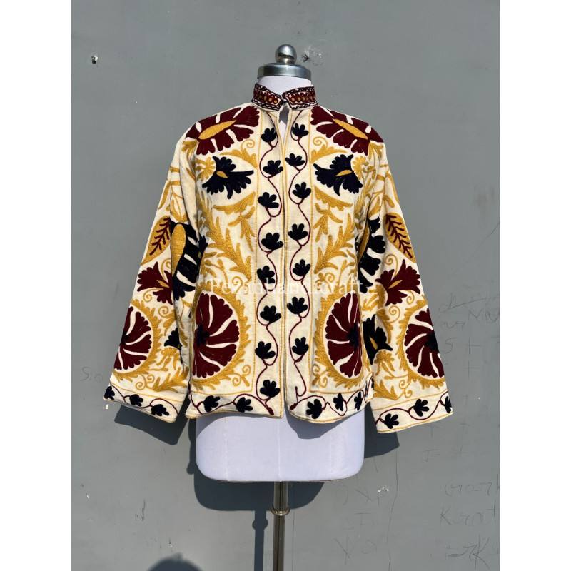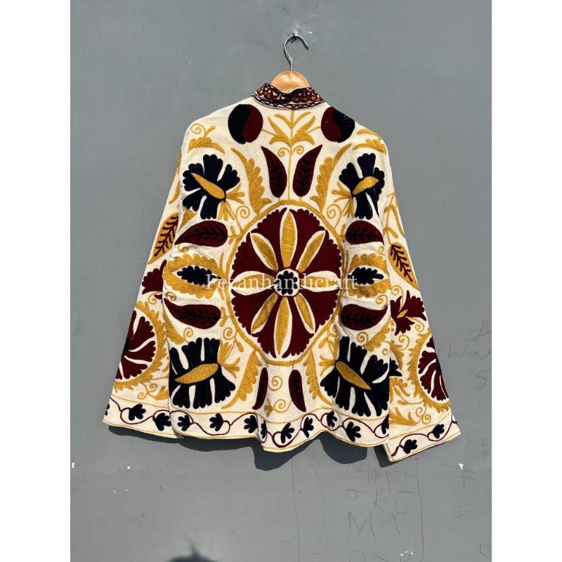 Unisex Uzbek Floral Embroidery Cotton Velvet Suzani Jacket Coat Women's Autumn/Winter Party Short Coat with Knitted Side Lining