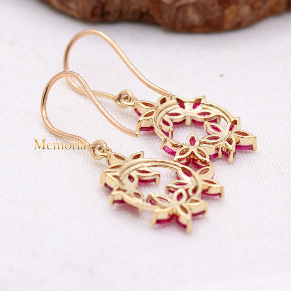 Flower Design Precious High Quality Ruby 14k Solid Yellow Gold Handmade Drop Dangle Earrings Jewelry for Wholesale